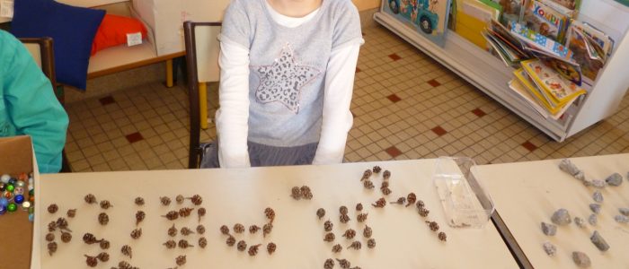 Nous avons présenté nos collections de 100 objets (des fèves, des graines, des feuilles, des smileys, des pâtes, des bouchons, des cailloux, des billes, des étoiles, ds sapins, des boulettes de papiers, des tissus, des empreintes, des glands, des coques de pistaches, des dessins) et trouvé celle d’Emilie, qui était cachée un peu partout dans la classe (100 poissons).