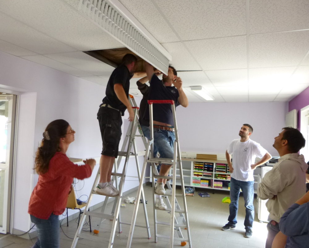 Samedi matin 26 mai, une douzaine de parents a participé à la dernière matinée bricolage de l’année organisée par les papas de la commission travaux de l’OGEC. L’objectif principal était d’aménager l’ancienne salle informatique en une salle divisée en deux parties: l’une pour les enseignants et l’autre pour l’informatique. Les travaux de peinture avaient été réalisés pendant les vacances de printemps. Toutes les plaques du plafond ont été changées, de nouveaux bureaux pour les ordinateurs ont été fixés au mur, un plan de travail avec de nombreux rangements en-dessous a été également posé, les rideaux ont été changés… Lundi matin, l’équipe enseignante et les enfants ont pu visualisé la nouvelle salle de notre école, tout le monde était enchanté… Vous pourrez voir dans le diaporama suivant l’ancienne salle du photocopieur et la nouvelle salle des enseignants… Tous ces changements n’auraient pas pu être faits sans la présence des parents ce samedi 26 mai… Nous les remercions vivement pour le temps donné à l’école…