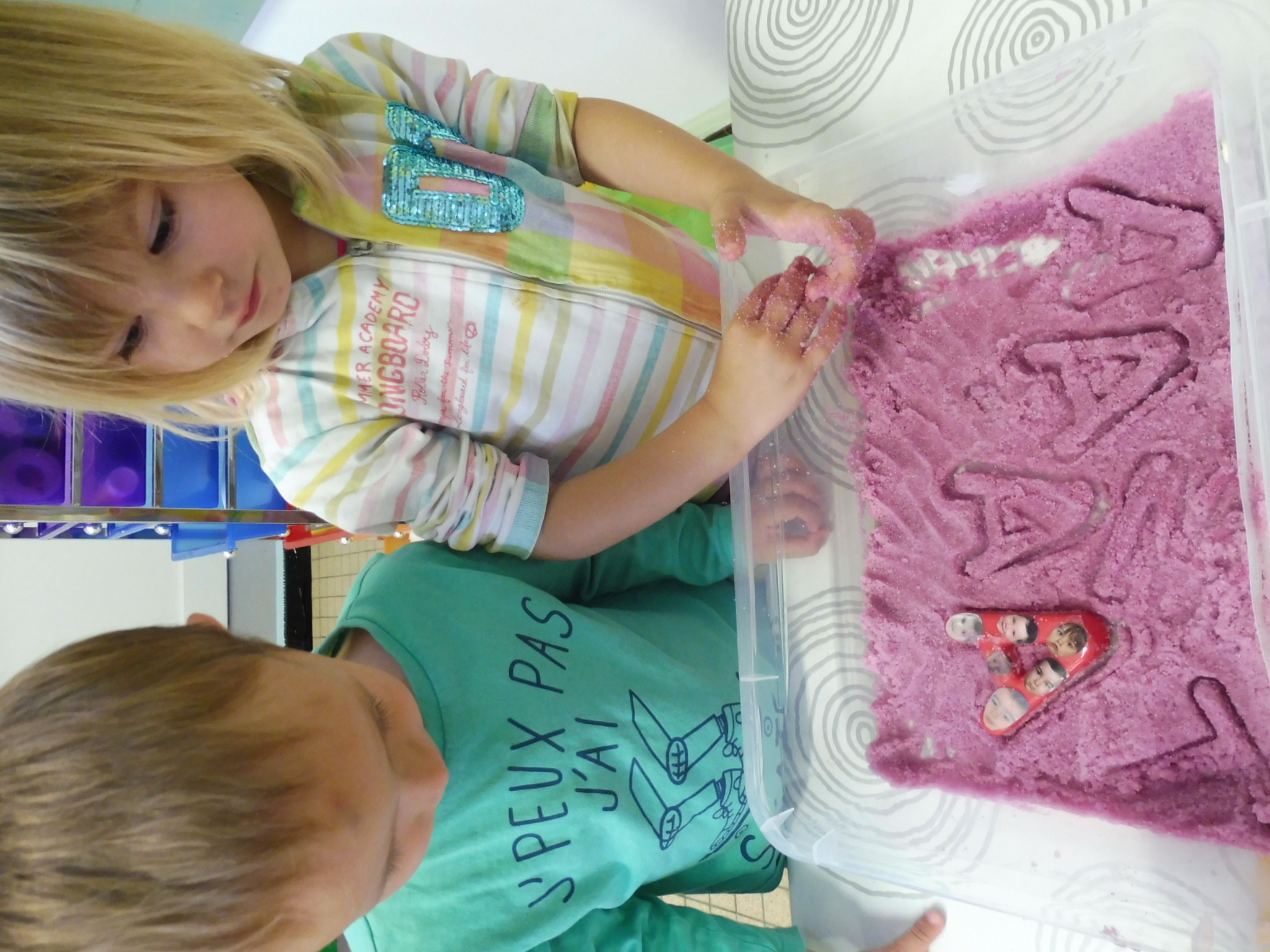 – faire des empreintes dans le sable coloré avec l’initiale de notre prénom