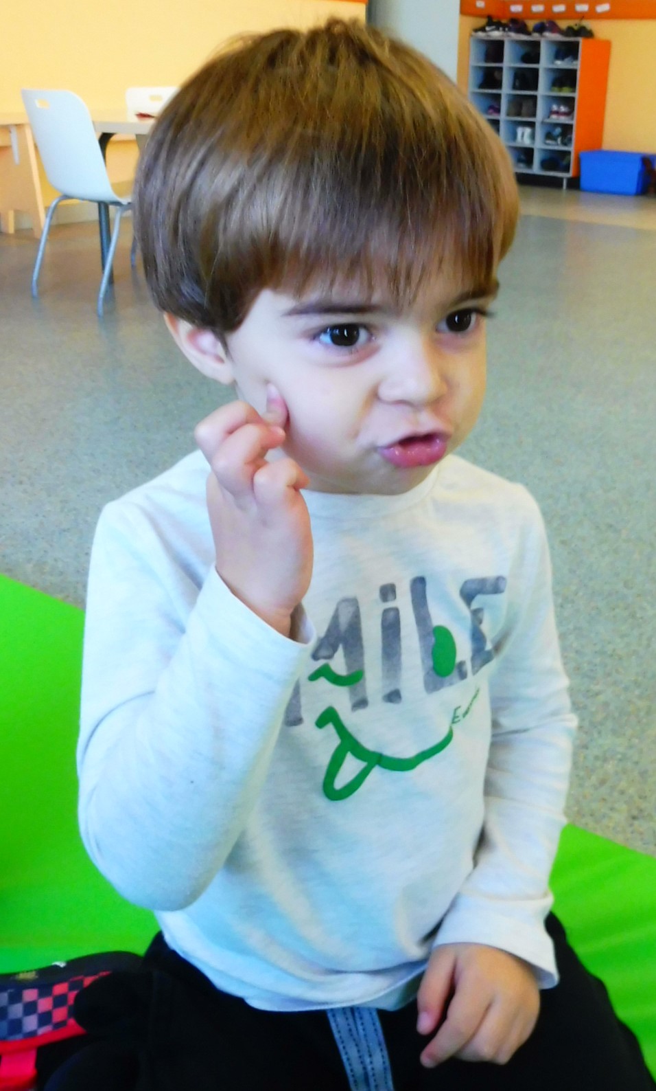 Nous apprenons à nommer les initiales des élèves de la classe et à les signer selon la méthode Borel-Maisonny.