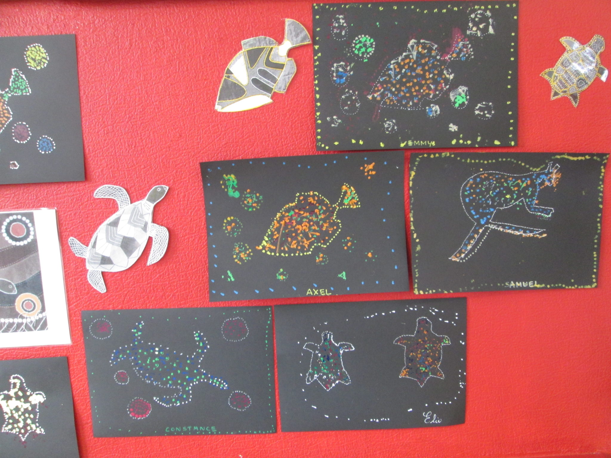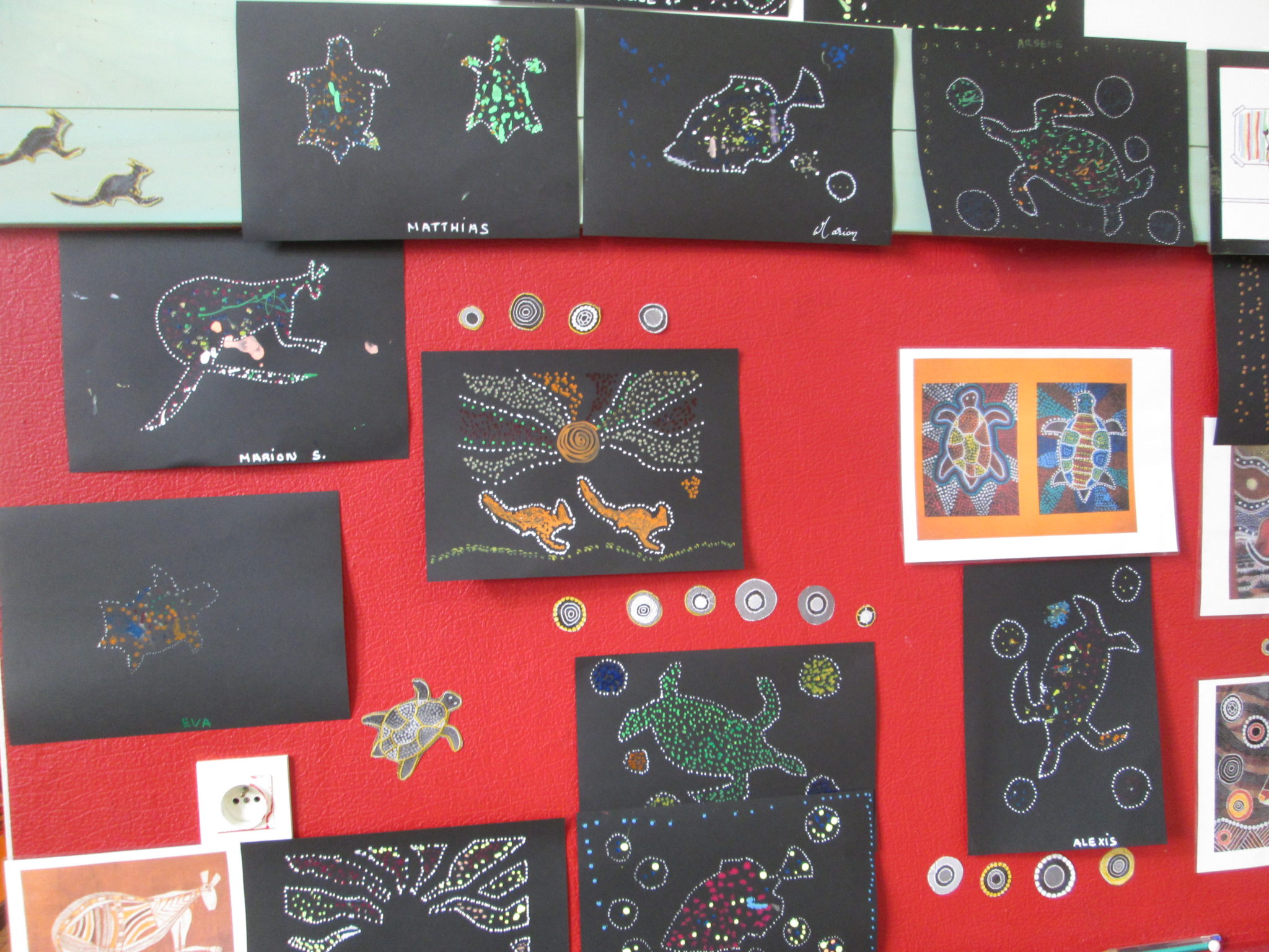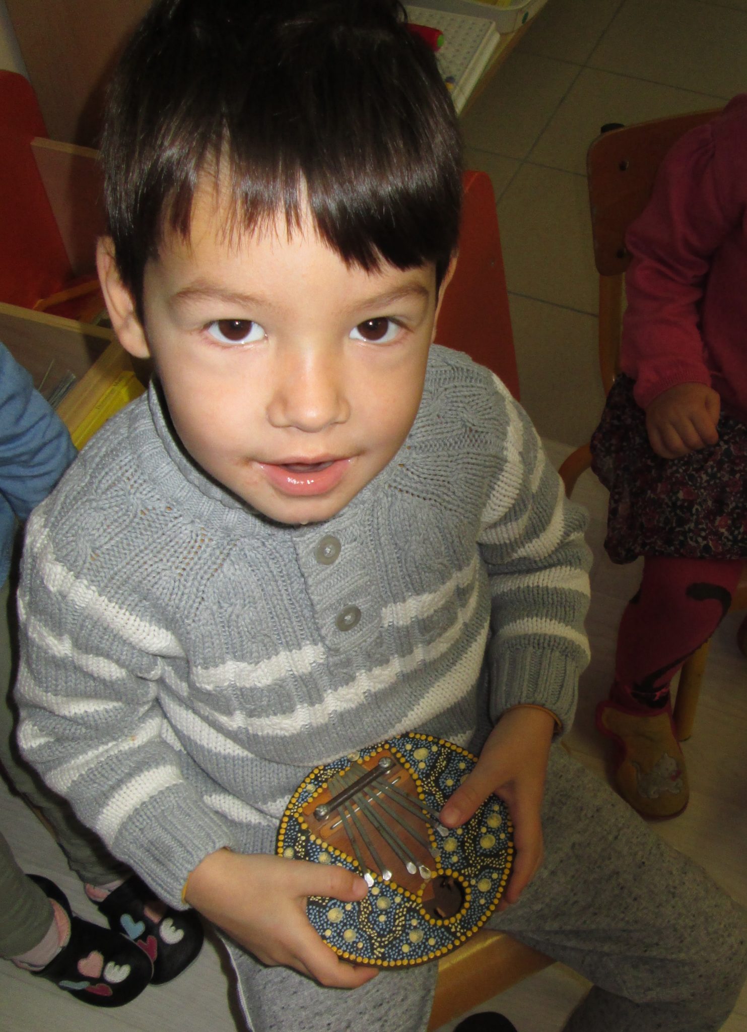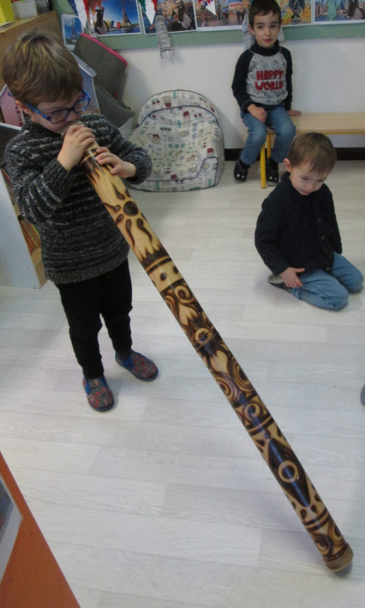P’tit loup nous a rapporté un didgeridoo en bambou d’Australie , une kalimba (ou piano à pouces) et un bâton de pluie décorés avec des points comme savent si bien le faire les Aborigènes d’Australie.