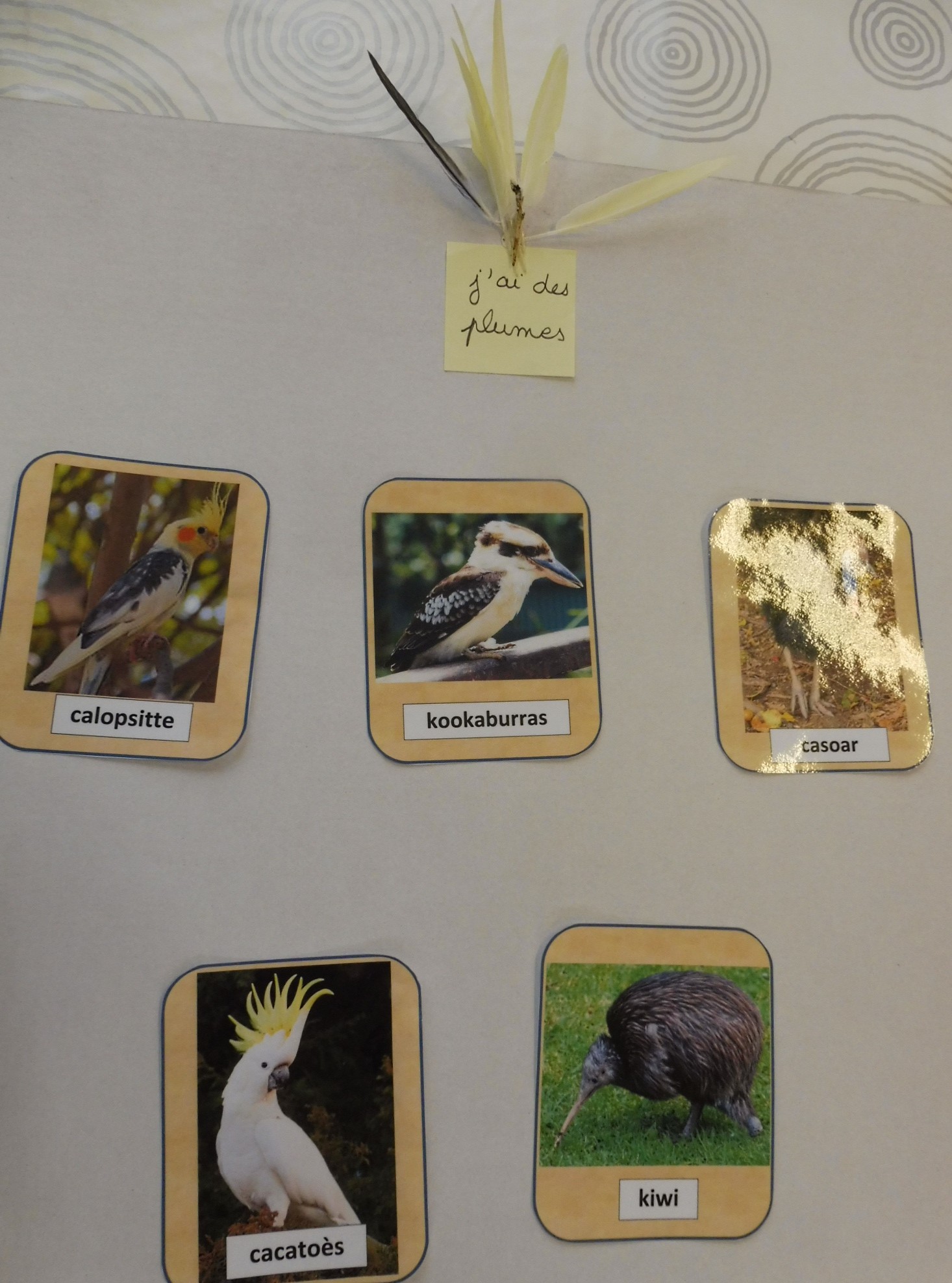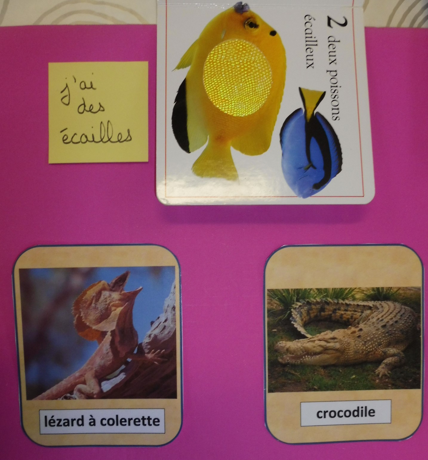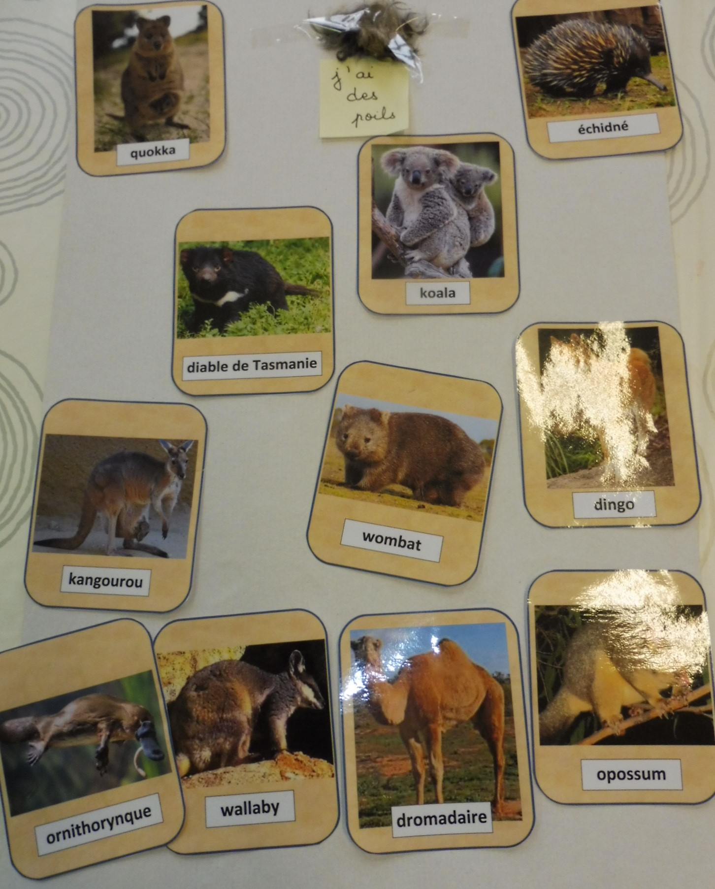Nous nommons les animaux qui vivent en Australie et apprenons à les classer selon des caractéristiques liées à leur peau: ” j’ai des poils”, ” j’ai des plumes” ou ” j’ai des écailles”.