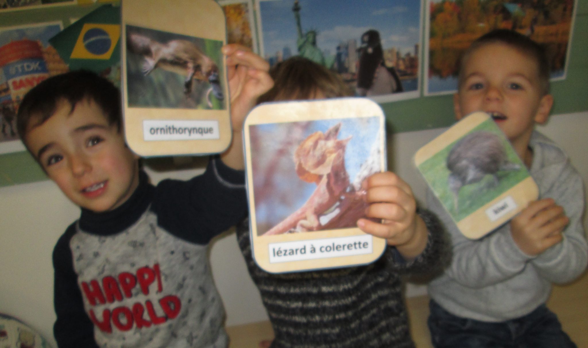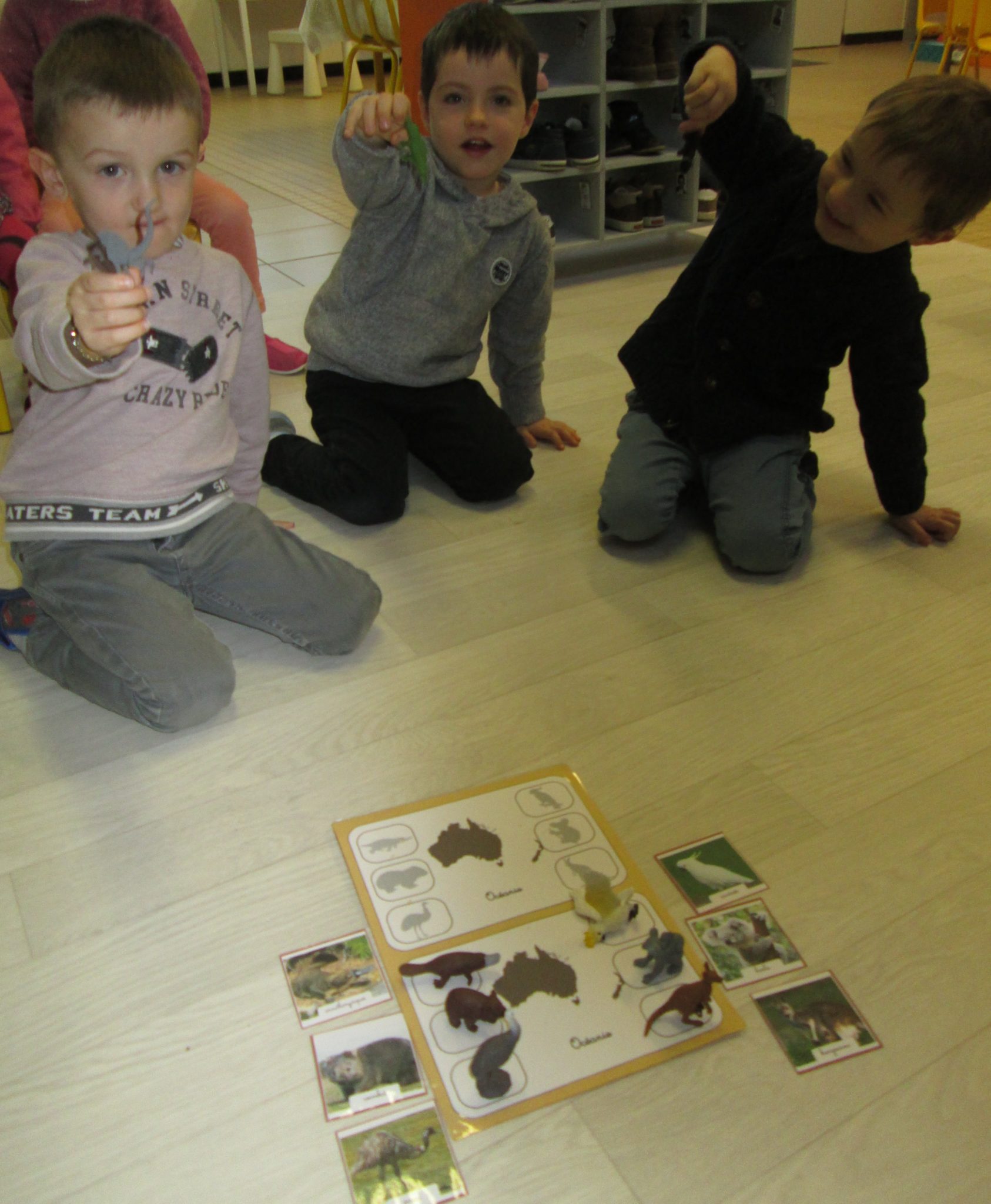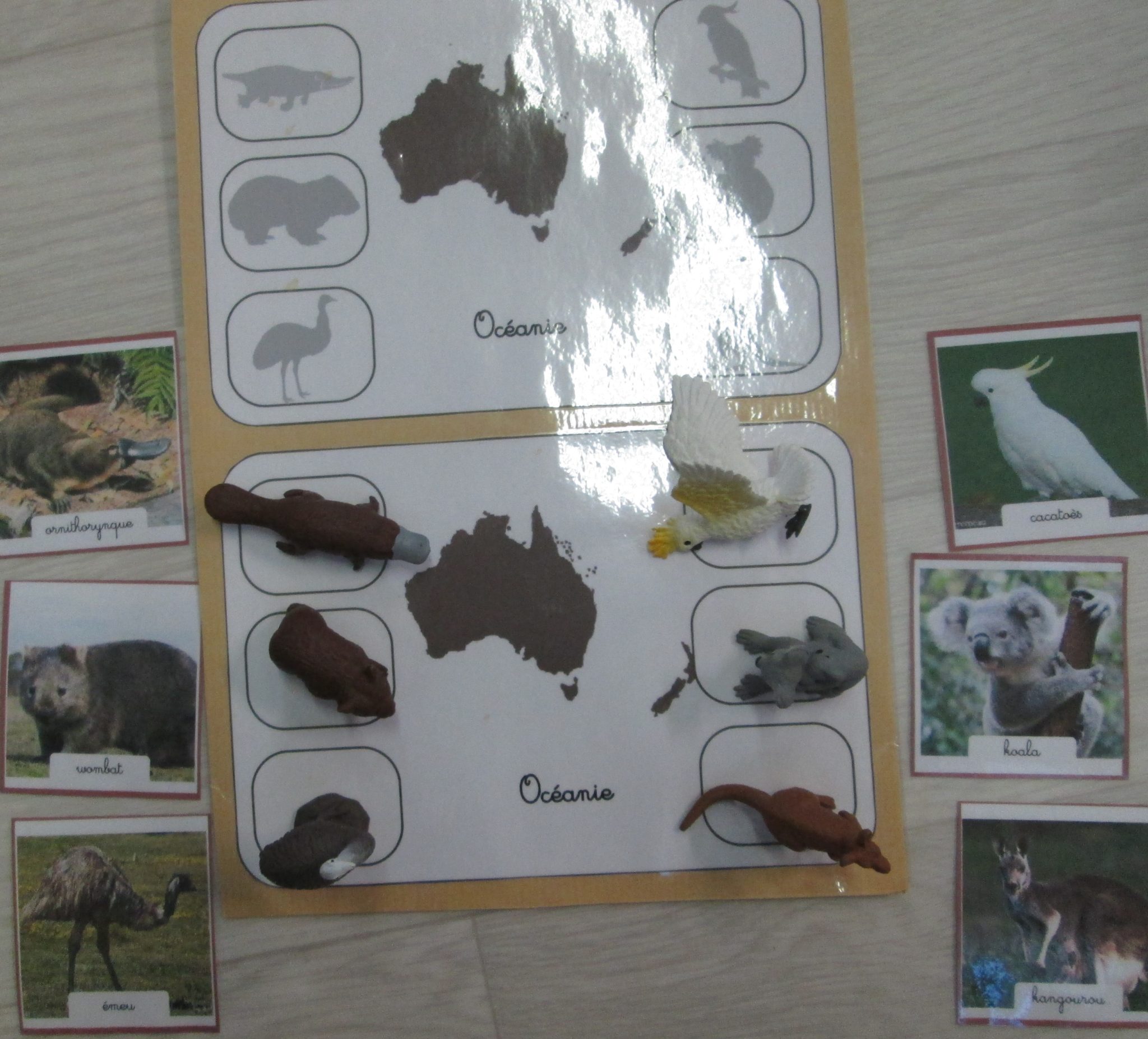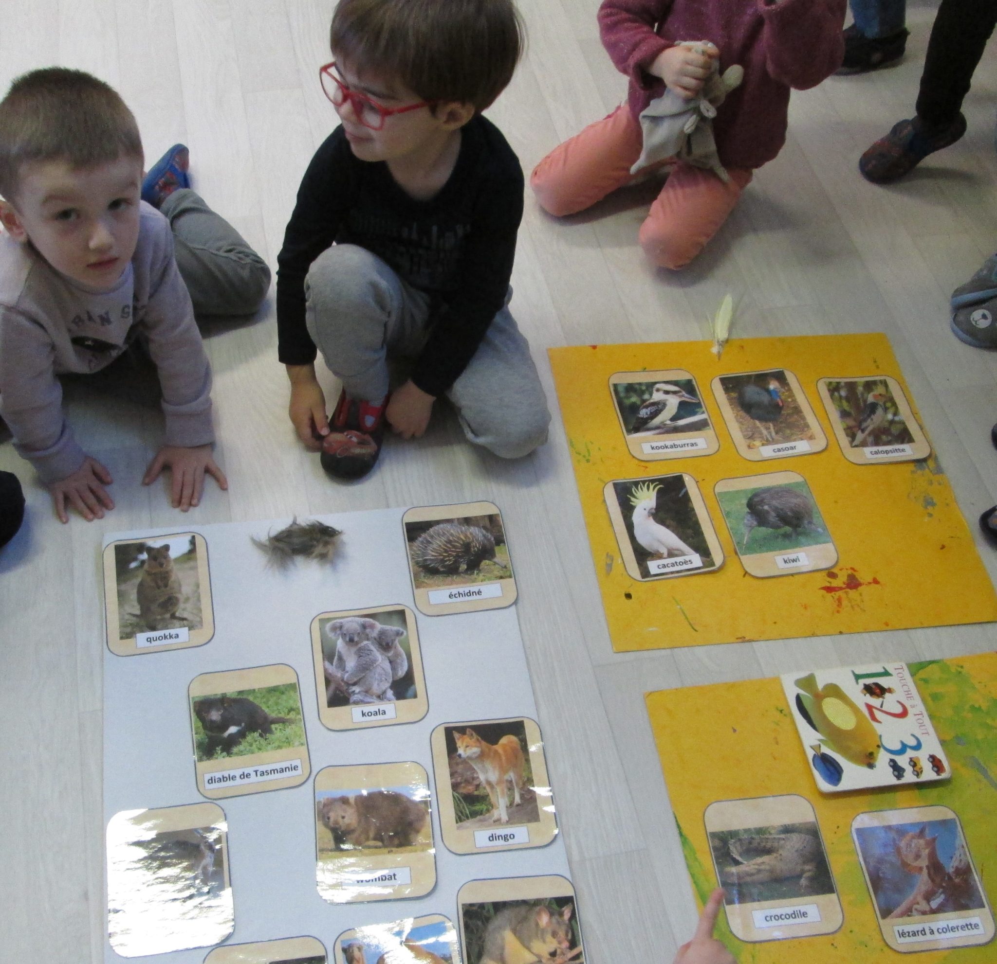 Nous nommons les animaux qui vivent en Australie et apprenons à les classer selon des caractéristiques liées à leur peau: ” j’ai des poils”, ” j’ai des plumes” ou ” j’ai des écailles”.