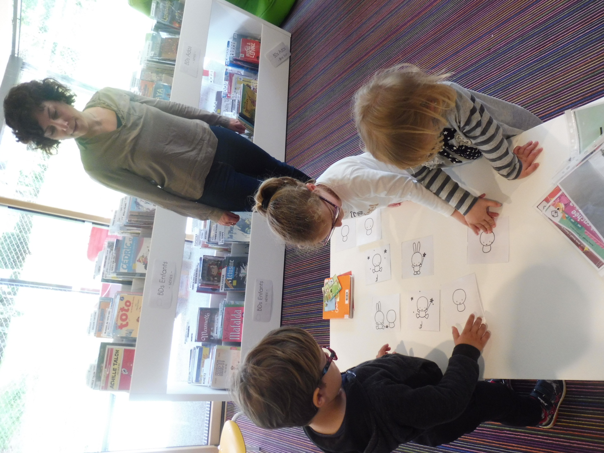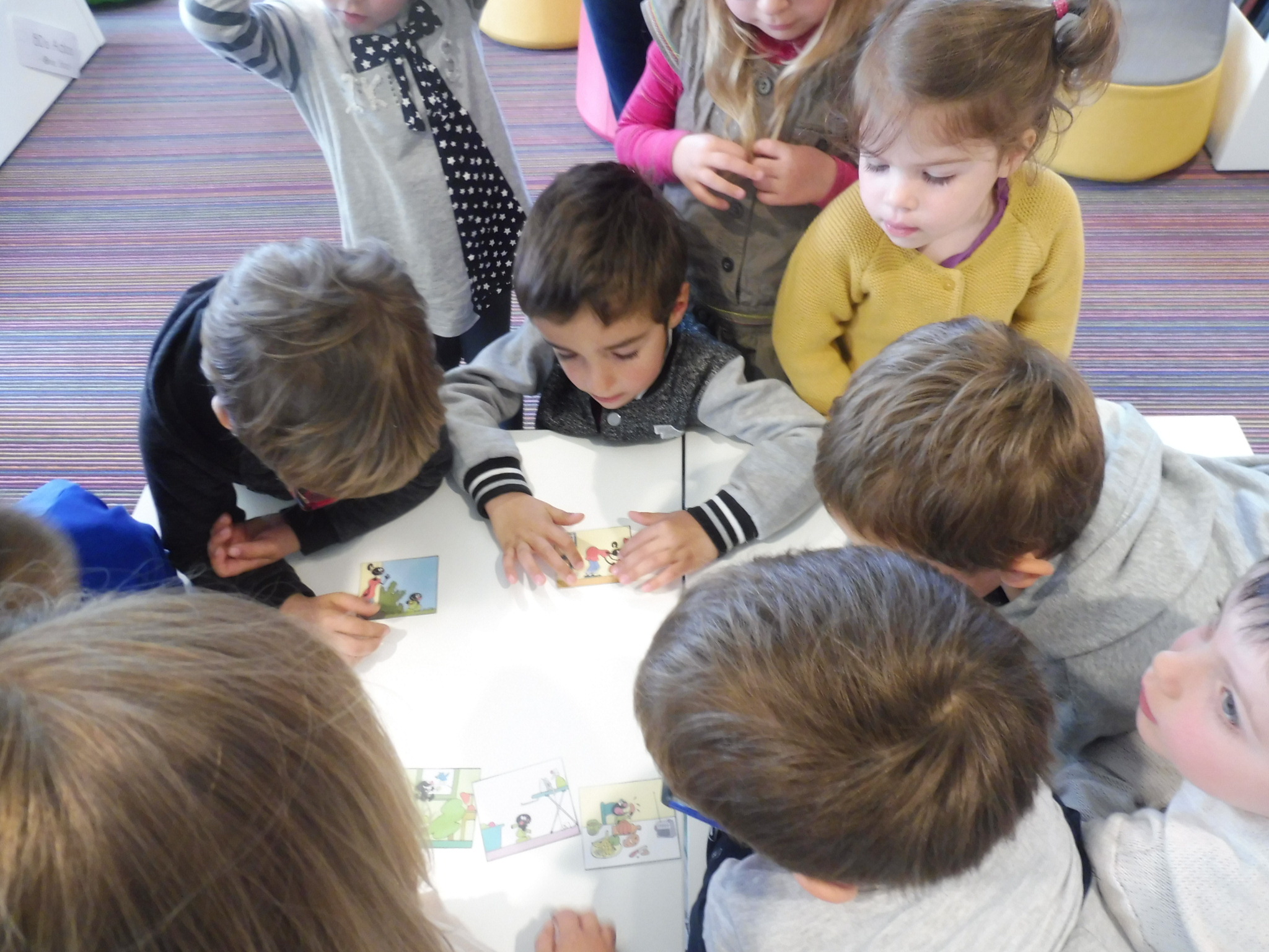 Nous avons écouté des histoires, feuilleté des livres, découvert les différents espaces, recherché des livres à partir de leur couverture et remis en ordre les images séquentielles de deux histoires.