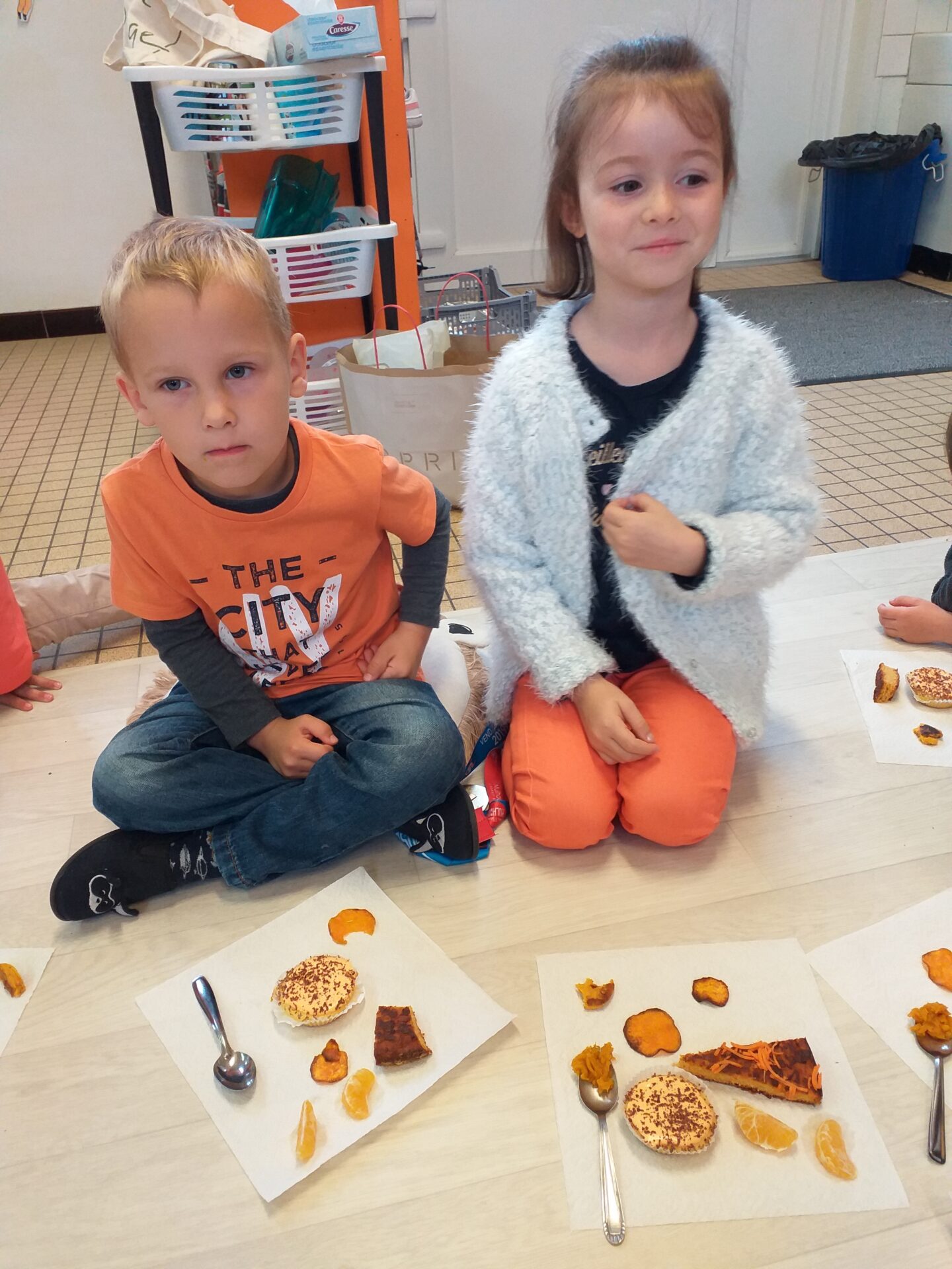 Lundi, une journée orange nous attendait : purée de carottes, oignon, gâteau aux carottes, clémentines, chips de patates douces, gâteaux à la crème à l’orange et galettes de carottes étaient au rendez-vous.