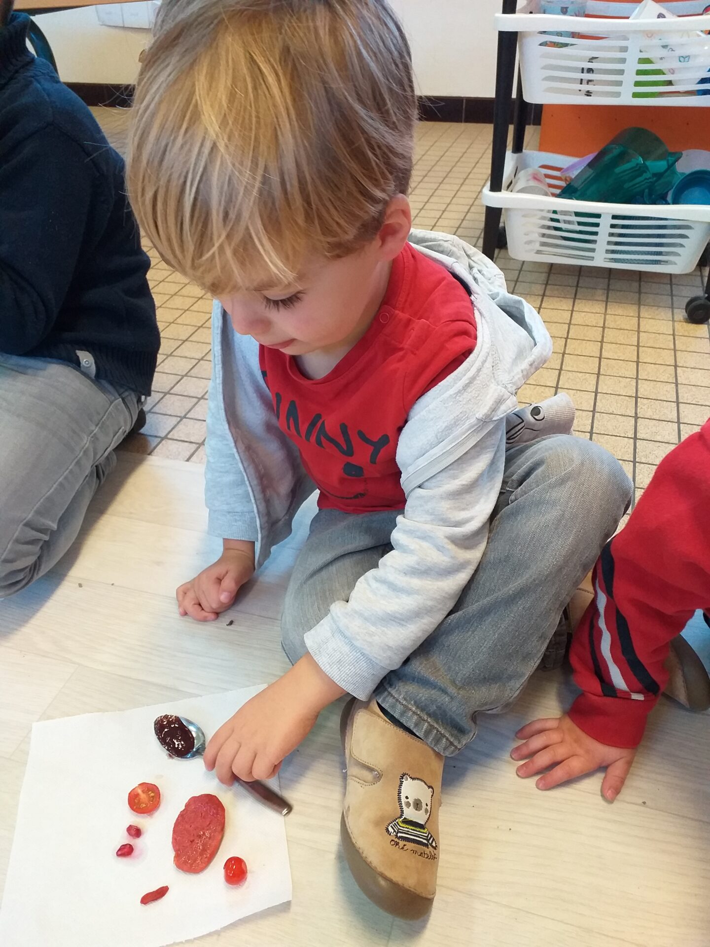 Jeudi, sous le signe du rouge, nous avons dégusté des bigarreaux confits, des baies de Gogi, de la confiture cerise/banane, du poivron rouge, des madeleines à la framboise, des raisins, de la grenade et des tomates.