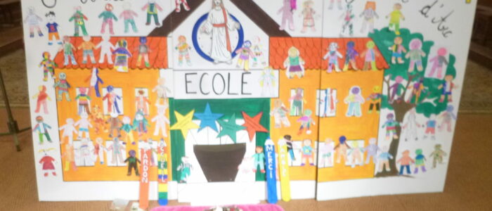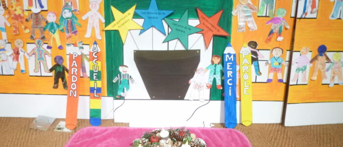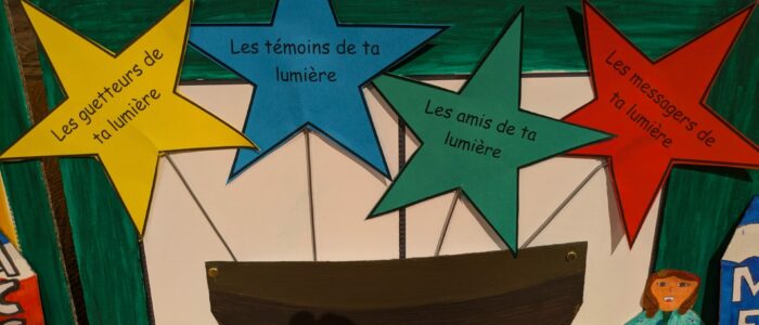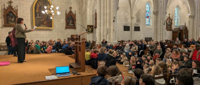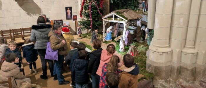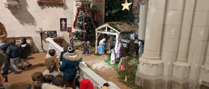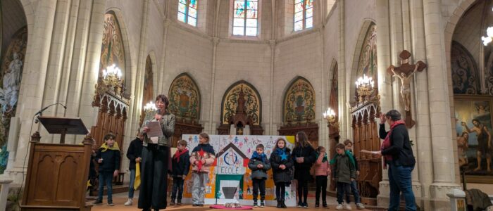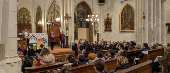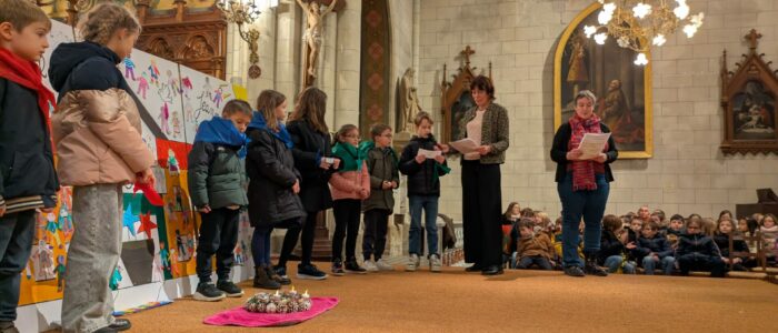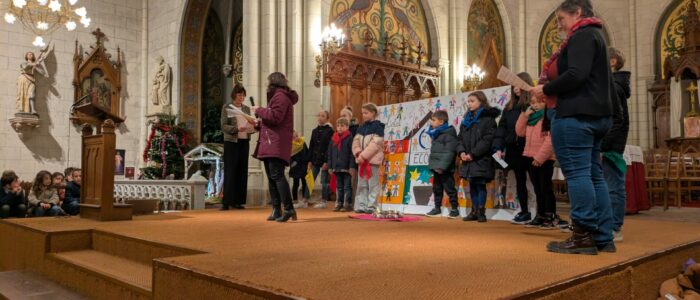 Mardi 16 décembre, à 9h15, les cloches de l’église ont sonné pour annoncer la célébration de Noël intitulée ” Un Noël de partage et d’amour, tout en couleurs et lumière”. Tous les élèves de la Petite Section au CM2 se sont retrouvés à l’église. Les enfants ont eu pour mission d’être des guetteurs, des témoins, des messagers et des amis de cette Lumière qu’est Jésus-Christ.  Après avoir écouté l’Evangile, nous avons chanté “ Suivre l’étoile qui mène jusqu’à Dieu”.  Le temps de prière universelle nous a permis de penser à toutes les personnes qui seront seules à Noël et à ouvrir notre cœur pour être encore plus solidaire. Pour terminer ce temps fort, chaque classe a reçu la prière de l’Etoile et est passée devant la crèche avant de quitter l’église.