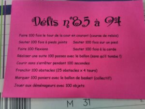 Vendredi 3 avril, c’est le 100ème jour d’école pour notre classe. Emilie a organisé 100 défis à réaliser dans la journée … Va-t-on réussir ????